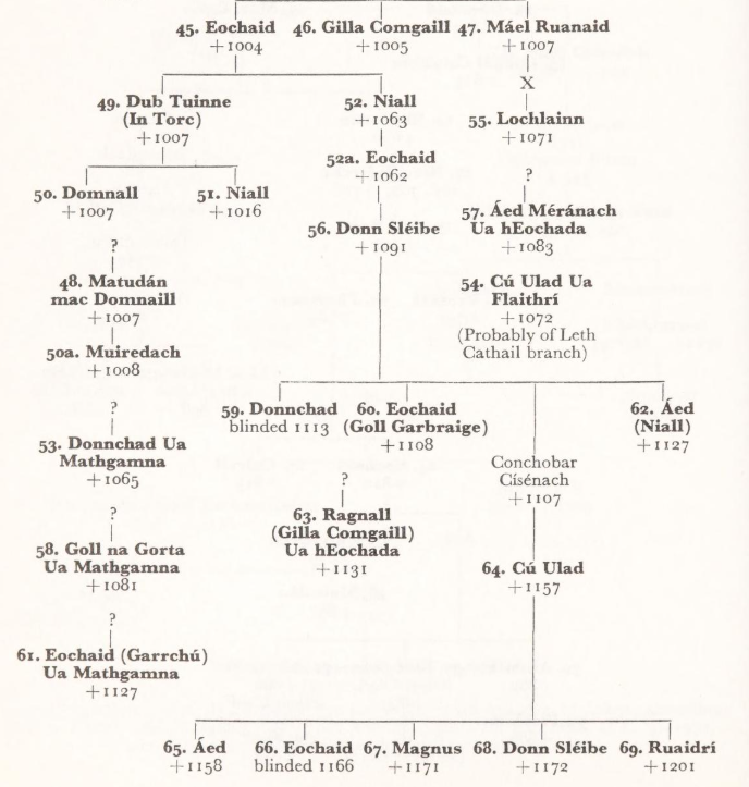 So, then the O'Neill tried to become kings of Ulster by annihilating the entire extended family (Dairfhine or True Family_of the Dál Fiatach king Eochaidh, the son of Ardhal. He is number 45 in the king list below. Five more kings were killed before 1016 when Niall took over and ruled until 1063 even outliving his co-regent son Eochaidh.